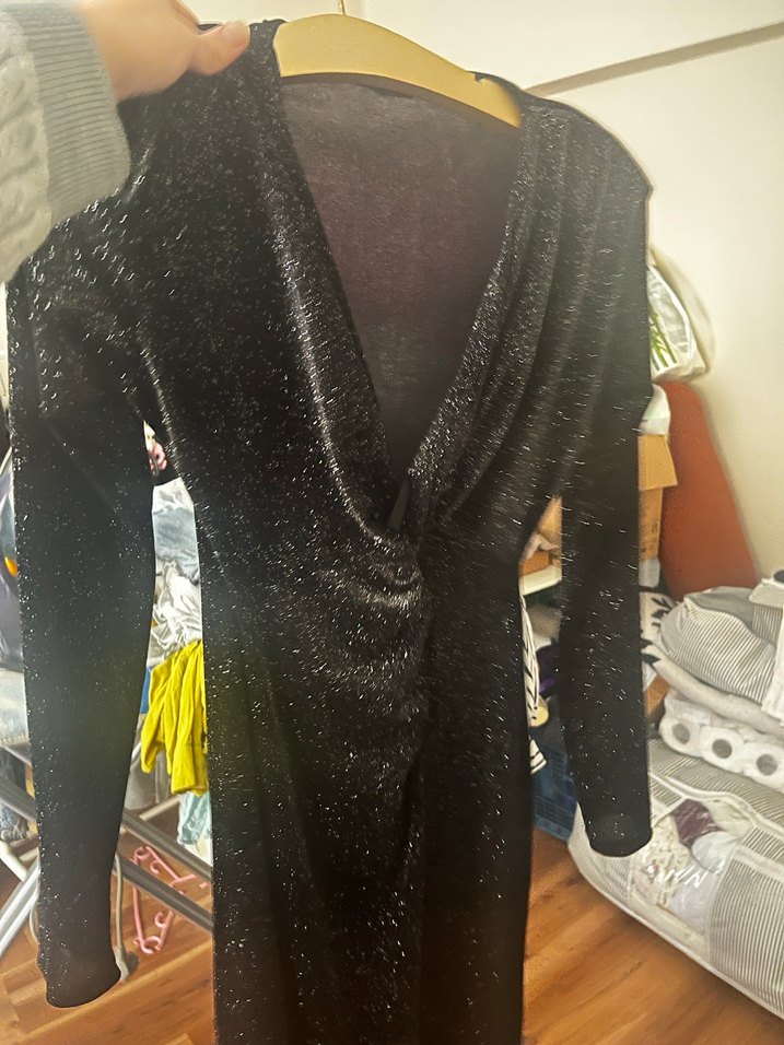 Drapeli tasarımı, V yakası ve uzun kollu siyah midi elbise, şık ve parti için uygun bir tercihtir. ✨