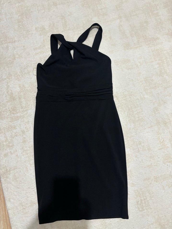 V yaka ve askılı, drapeli detaylı, siyah, dar kesim midi elbise. Cesur goth tarzını yansıtan parti elbisesi.