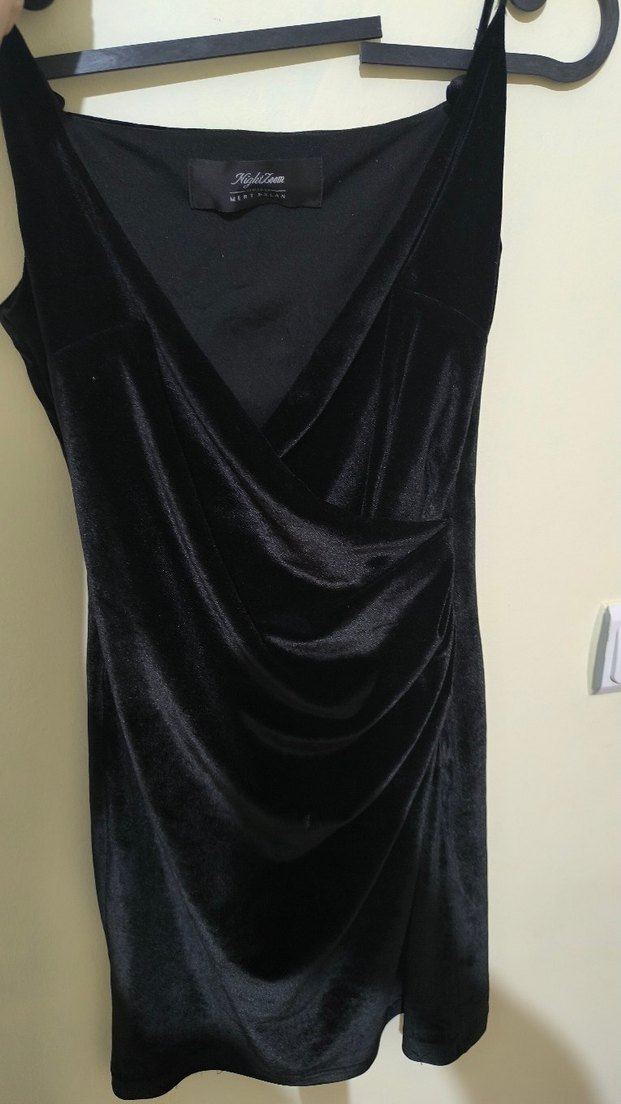 Siyah renkli, drapeli detaylı, V yakalı ve kolsuz, klasik goth tarzında midi boy kadın elbisesi.arka tarafında hafif bı delik var fotolarda bellirttim