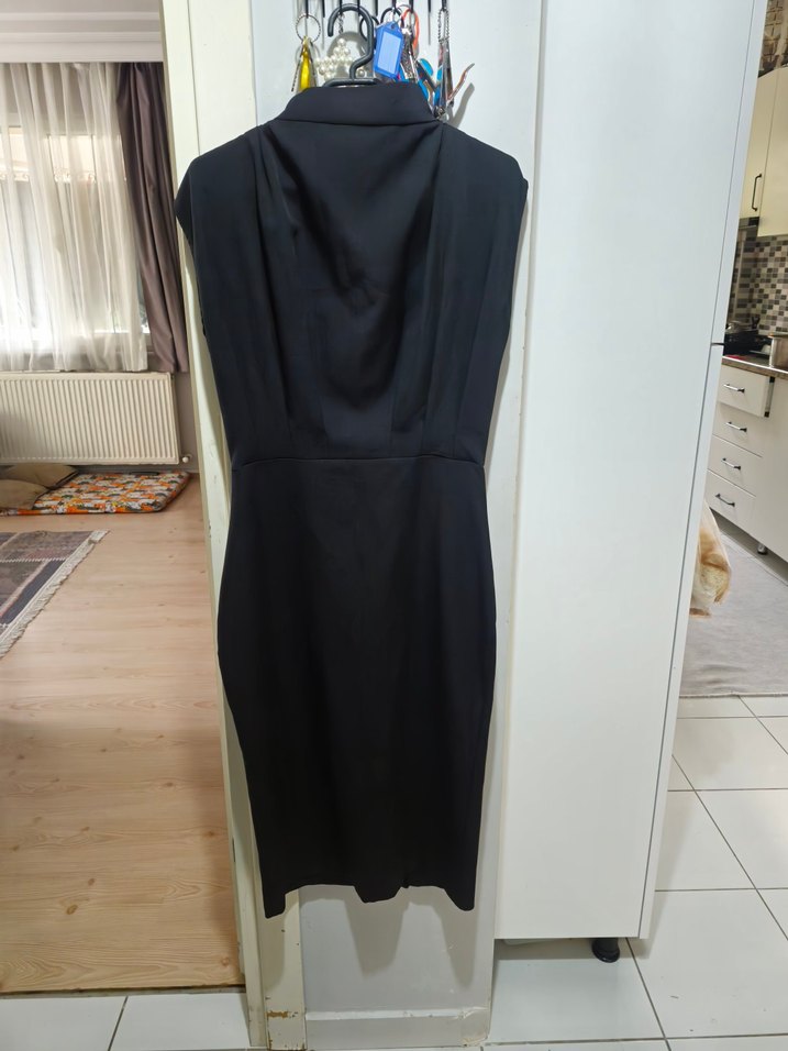 Bu siyah, v yakalı ve kolsuz, drapeli midi elbise, gotik ve avangart tarzları ofis şıklığıyla birleştirir.