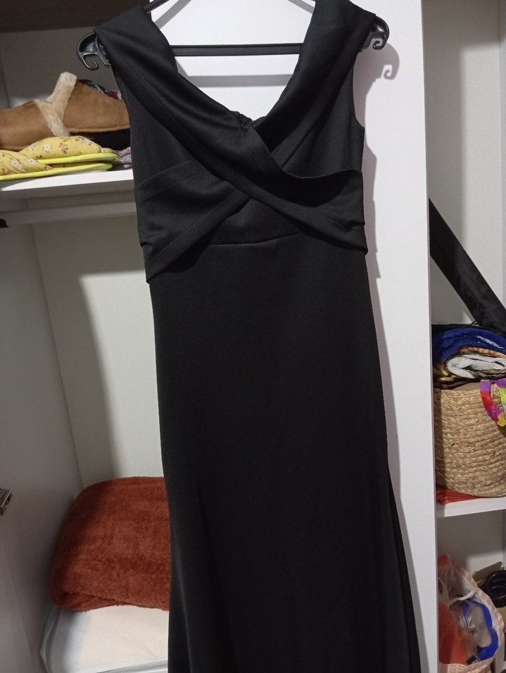 Drapeli V yakalı, kolsuz, uzun siyah elbise