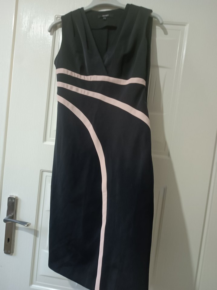 Siyah, kolsuz, v yakalı ve drapeli detaylı uzun kalem elbise. Ofis için uygun, çağdaş baskılı tasarıma sahip.