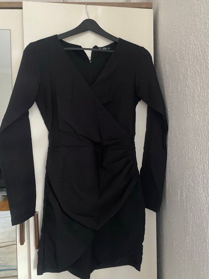 Siyah Drapeli V Yakalı Uzun Kollu Mini Elbise