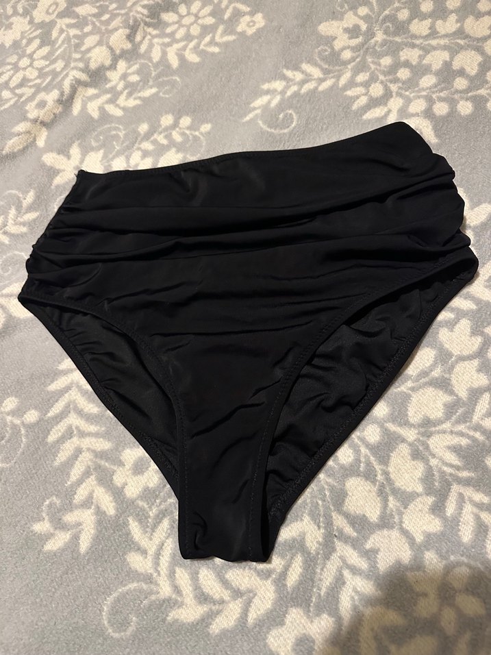 Siyah renkte, drapeli tasarıma sahip yüksek bel bikini altı. Midi boyda ve fit kesimli, plaj için uygun, cesur goth athleisure tarzına uyumlu. 2 kere kullanıldı en fazla hiçbir sorunu yoktur