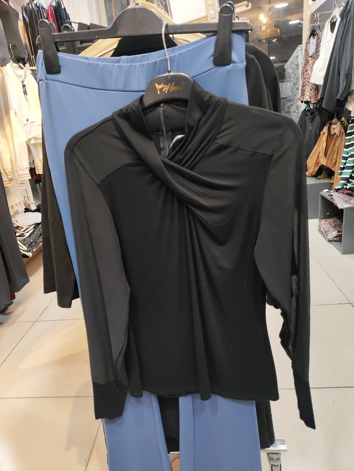 Siyah renkte, yüksek yakalı ve uzun kollu kadın bluz. Drapeli tasarımı ve rahat kesimi ile ofis için uygundur. Yumuşak sentetik kumaştan üretilmiştir.