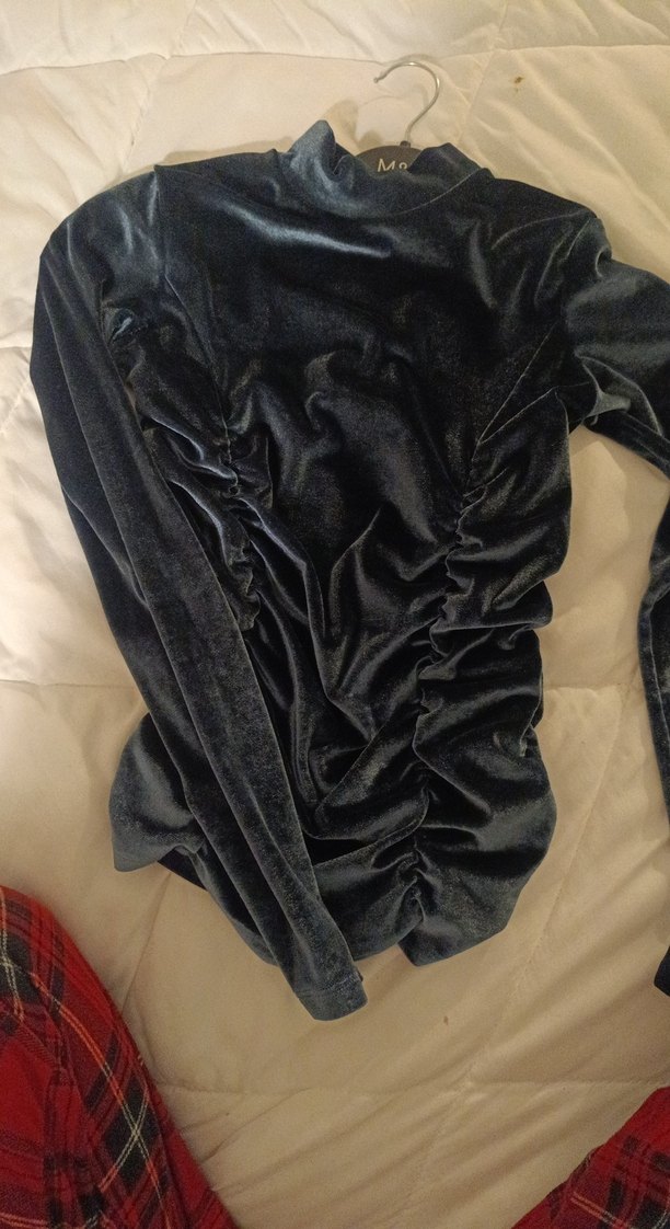 Yumuşak sentetik kumaştan yapılmış, yüksek yakalı ve uzun kollu siyah, drapeli, vücuda oturan kadın bluz. Gotik ve avangart tarzda, parti için uygun.