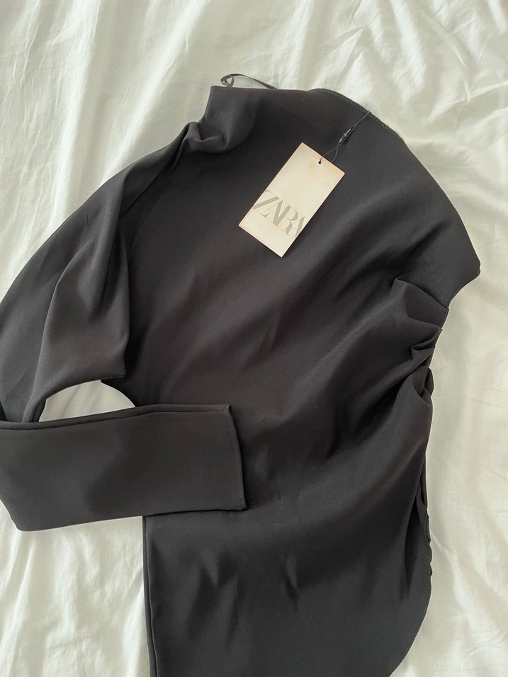 Siyah, uzun kollu, yüksek yakalı ve drapeli tasarıma sahip, ince kesim kadın bluz. İpeksi kumaştan üretilmiş, baskılı deseniyle günlük kullanıma uygun minimal stil sunar.