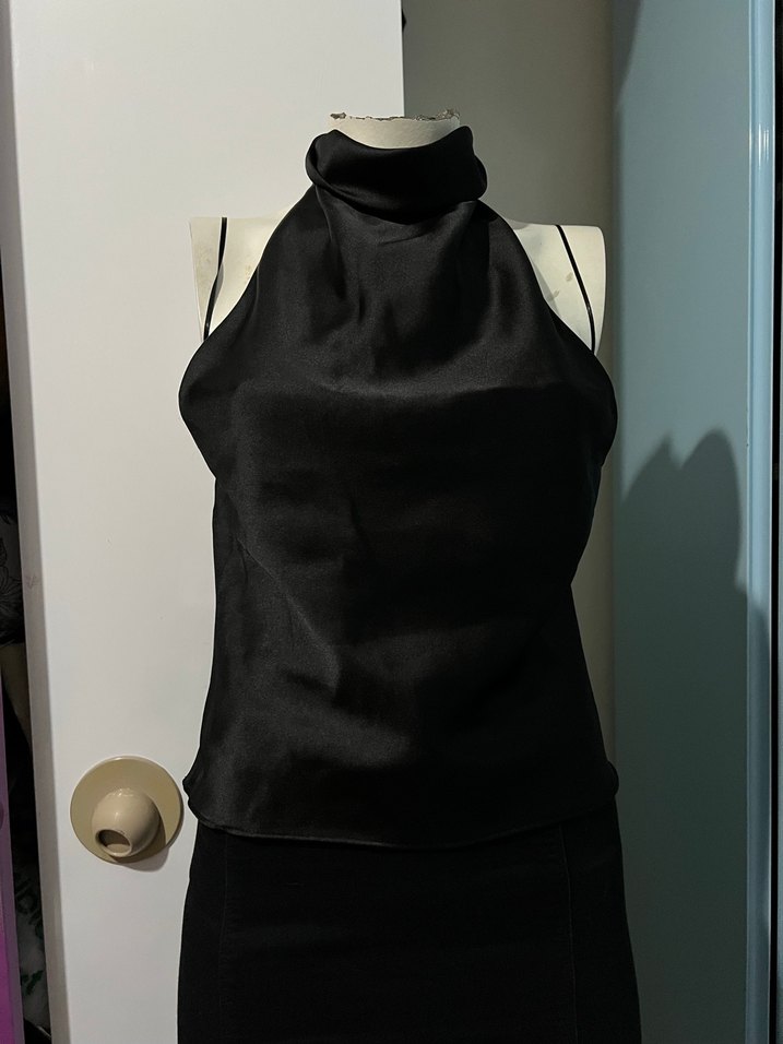 Drapeli ve yüksek yakalı, kolsuz siyah bluz, ince kesimiyle minimalist gotik tarzı tamamlar. Orta boy, ipeksi kumaştan üretilmiştir.