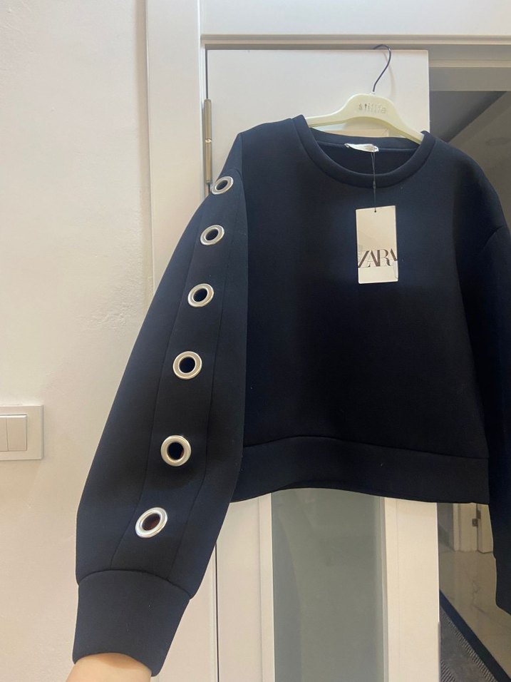 Siyah Düğme Detaylı Kısa Sweatshirt