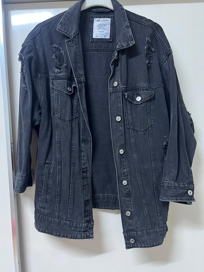 Siyah kot kumaştan yapılmış, bol kesim ve uzun kollu, düğmeli önden kapamalı, yıpranmış detaylara sahip grunge punk tarzında kadın ceket.