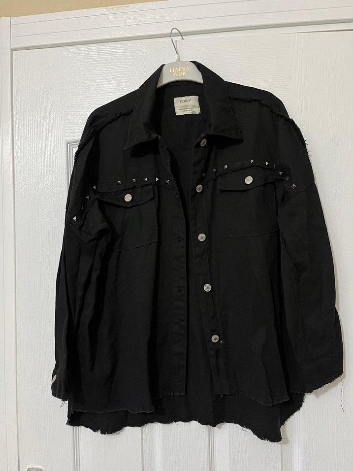 Siyah kot ceket, düğmeli ön, uzun kollu ve kesik yaka detaylıdır. Bol kesim ve normal uzunluktadır. Günlük sokak stiline uygundur. ✨
