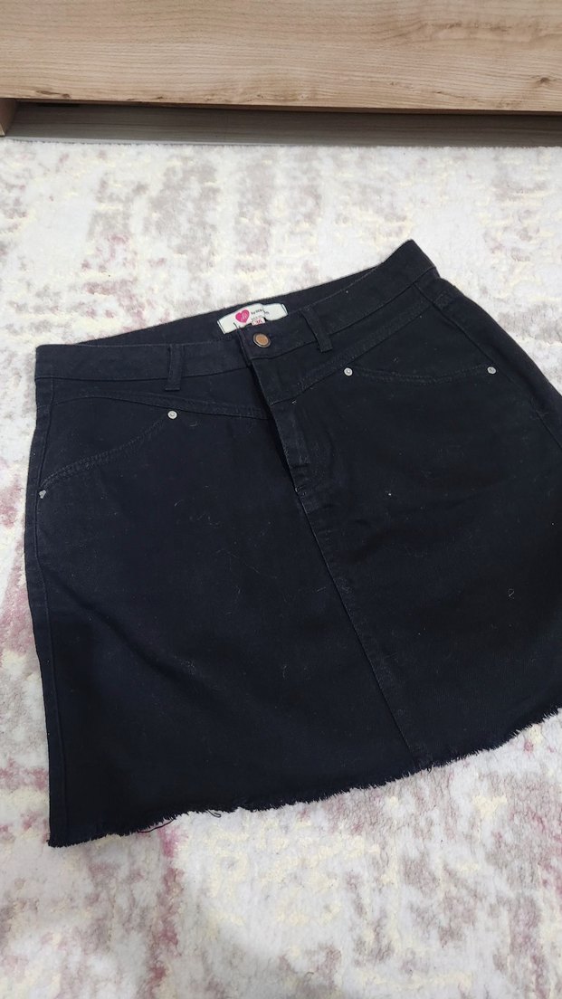 Siyah kot kumaştan bol kesim mini etek, düğmeli kapama ile rahat bir kullanım sunar. Günlük sokak stiline uygun, desensiz ve normal boyda. koton s beden siyah kot etek