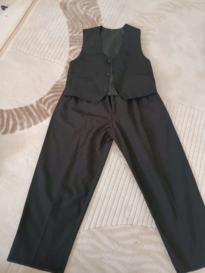 Düğmeli ve kolsuz, siyah çocuk takım elbisesi, keskin yaka detayıyla modern ve şık bir goth tarzı sunar. özel dikim Sadece denendi alan kişi pantolonun paçalarıni terzi de yaptırması lazim yelek 4 yas pantolon 4.5 yaş