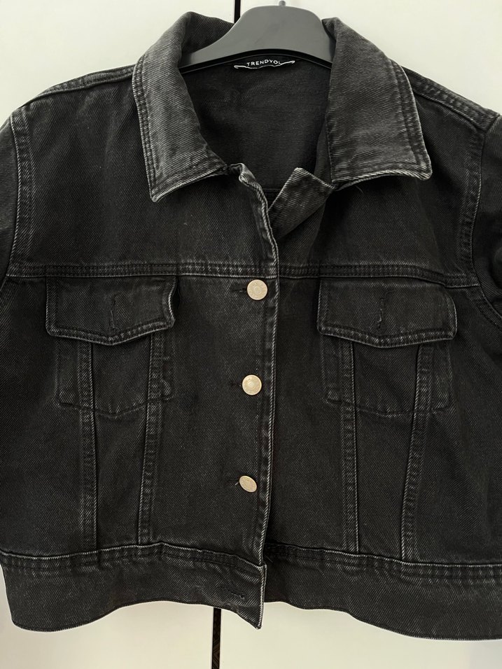 Siyah renk, düğmeli denim ceket. Notlu yaka ve bol kesimiyle günlük sokak stiline uygundur.