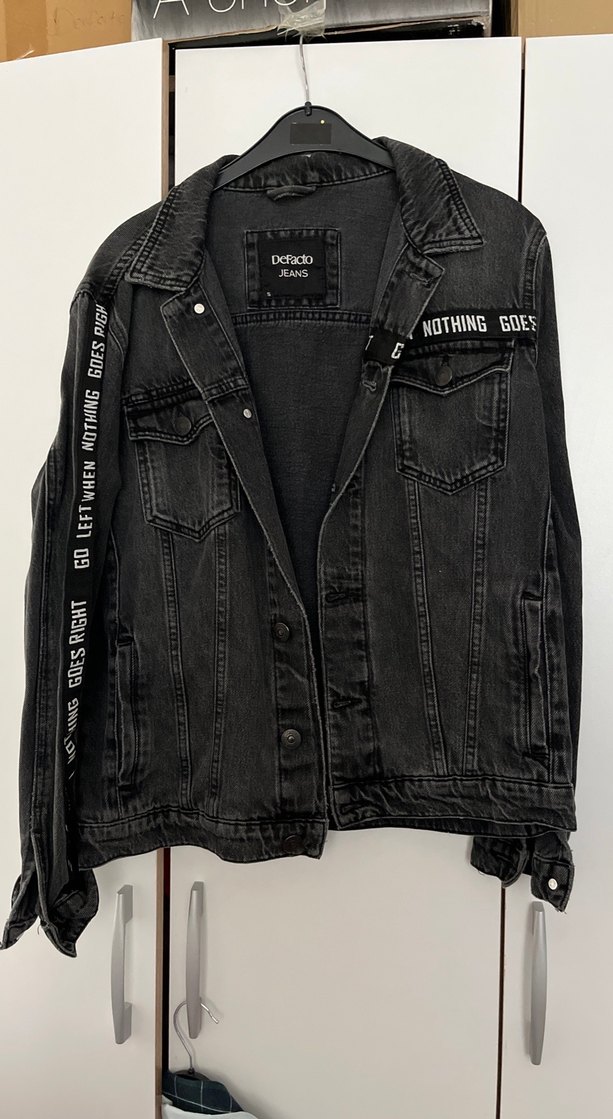 Siyah renk, düğmeli, bol kesim denim ceket. Notched lapel yakalı, sokak tarzı ve yazı detaylı. Kolları askılı ve üzeri yazılı. Erkek reyondan ama salaş olsun diye aldım salaş duruyor biraz kullanıldı hasar tok