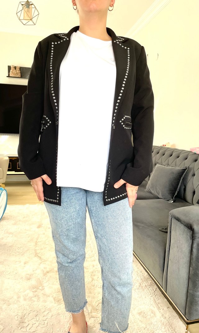 Bu siyah denim kadın blazer, kesimli yakalı ve uzun kolludur. Orta boy ve düğmeli tasarımıyla günlük sokak modasına uygundur. ✨1 kez giyildi