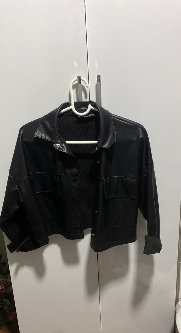Siyah deri, uzun kollu, düğmeli, tam kalıp kadın ceket. Günlük sokak stiline uygundur. Defosu yok az gıyıldı