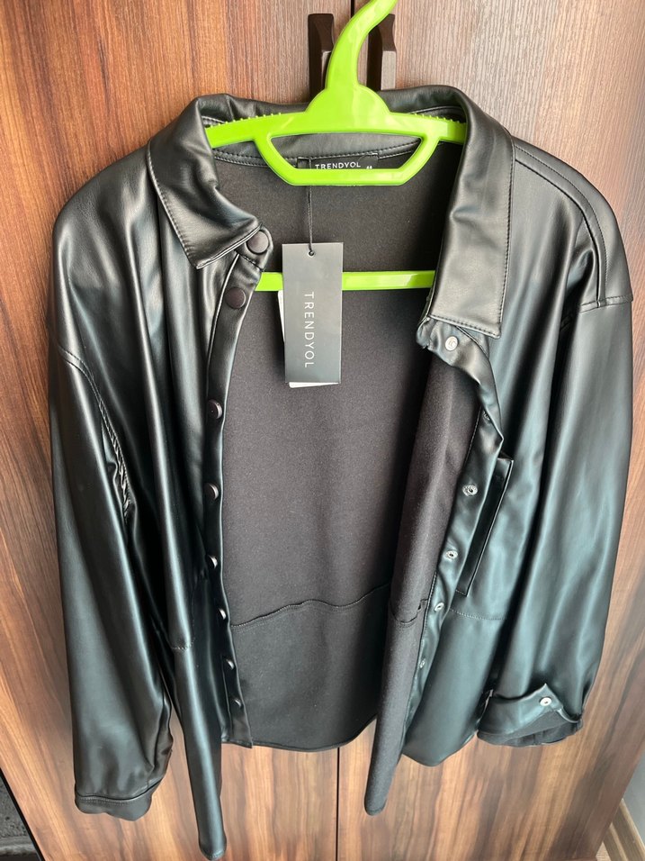 Siyah deri kadın ceketi düğmeli ön ve kesik yakaya sahiptir. Uzun kollu ve normal kesimdir, günlük rahat kullanım için uygundur.