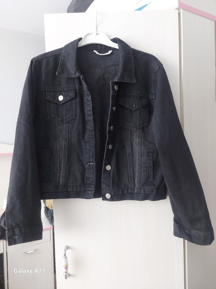 kalıbı küçük 36 ve 34 bedene rahatlıkla olur Siyah renkli, düğmeli, uzun kollu, normal boyda, dar kesim kadın denim ceket. Notlu yaka detayı ve günlük sokak stili için uygundur.
