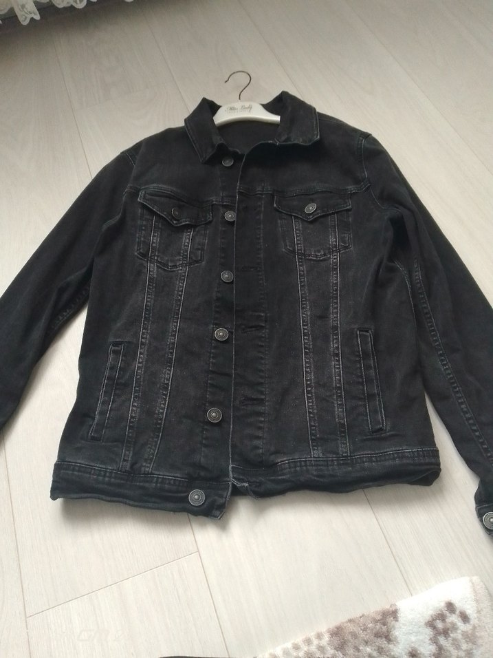 Siyah renkli, düğmeli, uzun kollu, notched lapel yakalı, bol kesim erkek denim ceket. Günlük kullanım için uygun, rahat ve şık bir parça.