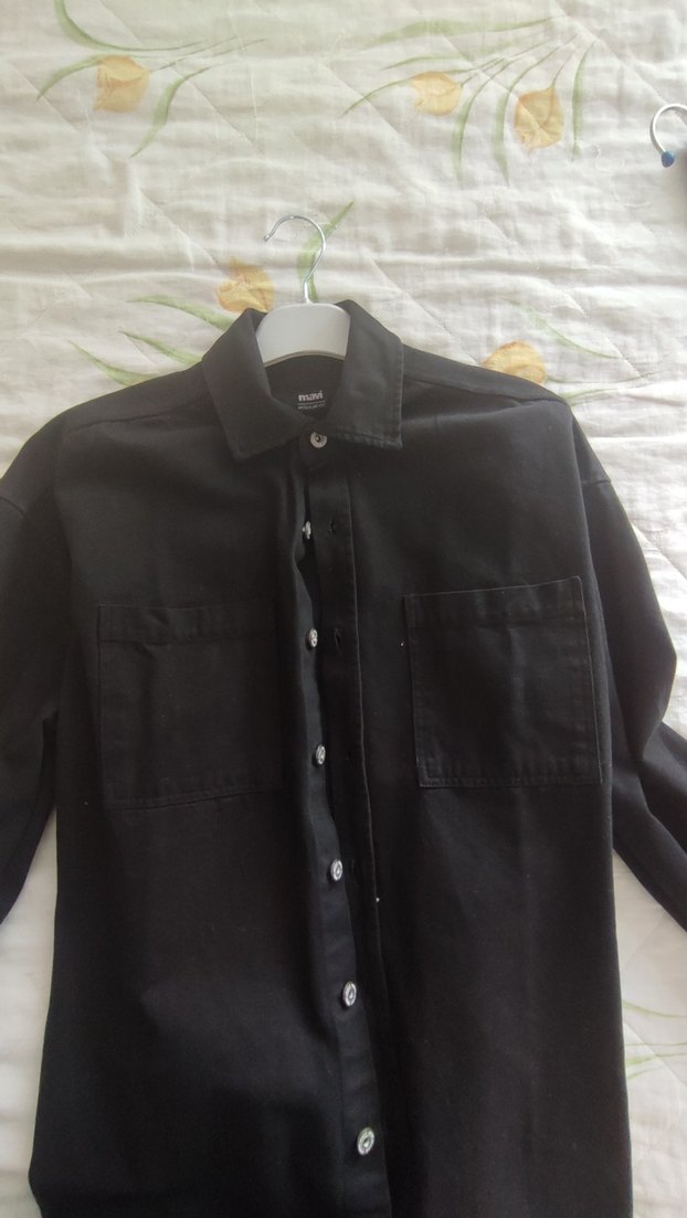 Siyah düğmeli denim gömlek, yaka ve uzun kollu. Salaş kesim, iki ön cep ve günlük sokak tarzına uygun. Sadece altını kestirdim hiç giymedim sonbahar ve kışın kullanılabilir