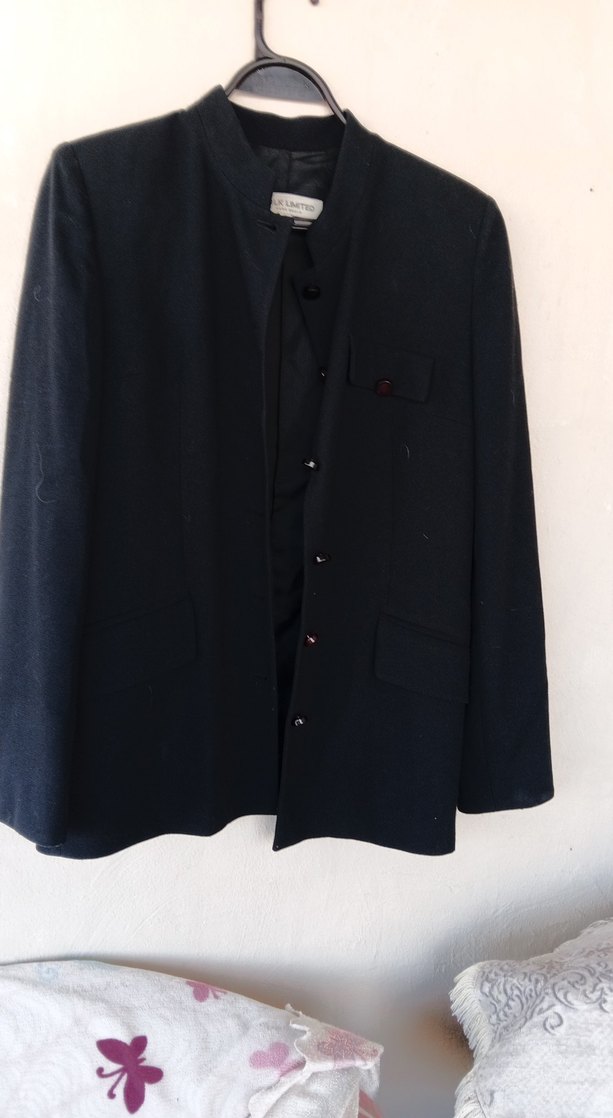 Saten dokulu, siyahi, küçük yakalı ve düğmeli kapamalı. Normal kesim, uzun kollu ve desensiz, klasik şıklık sunar.