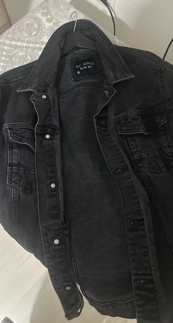 Siyah, düğmeli ve normal uzunlukta, dar kesim Erkek kot ceket. Notlu yaka ve askılı kollarıyla günlük sokak stili için uygundur.