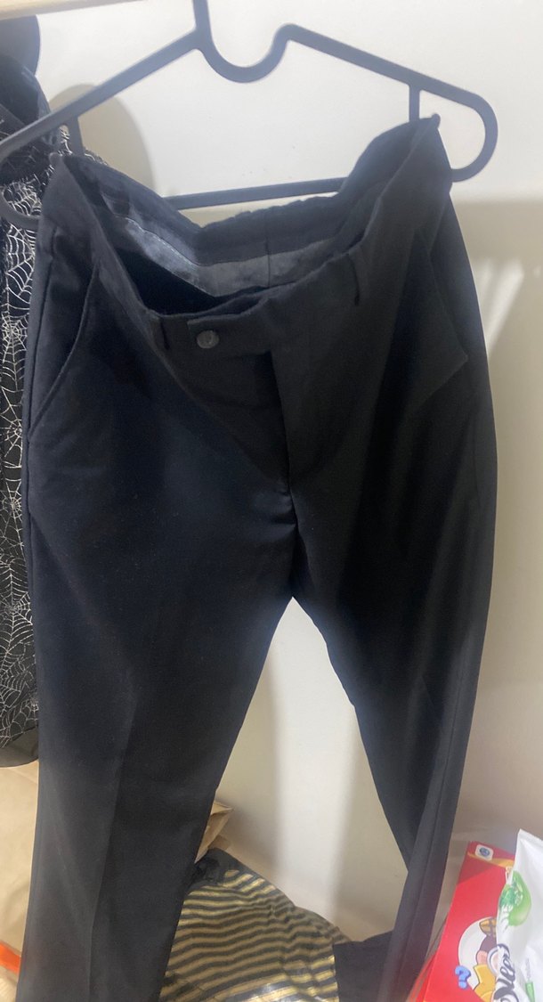 Düğmeli, siyah, erkek kumaş pantolon. Normal boy, sentetik kumaştan, ofis ve sokak stiline uygun. 44 beden