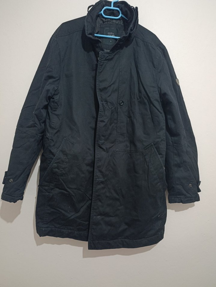 Düğmeli, siyah erkek midi ceket, notched lapel yakaya sahip. Regular fit ve uzun kollu. Sentetik kumaştan, dış mekan kullanımı için uygun.