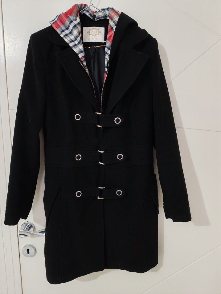 Siyah erkek midi kaban, düğmeli ön ve kesik yaka detayıyla. Uzun kollu, regular fit ve yumuşak, polar benzeri kumaşa sahip. Kapüşon içinde kareli astar bulunur.