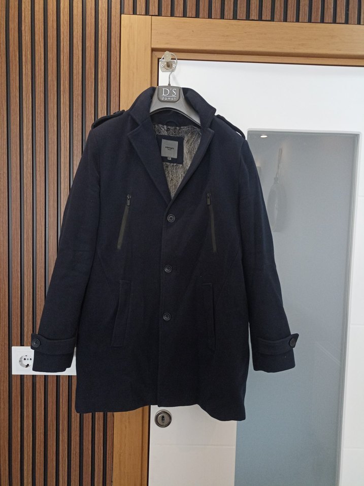 Siyah, düğmeli, erkek midi kaban. Notlu yaka, uzun kollu, rahat kesim, yumuşak ve sıcak kumaştan, günlük kullanım için uygundur.