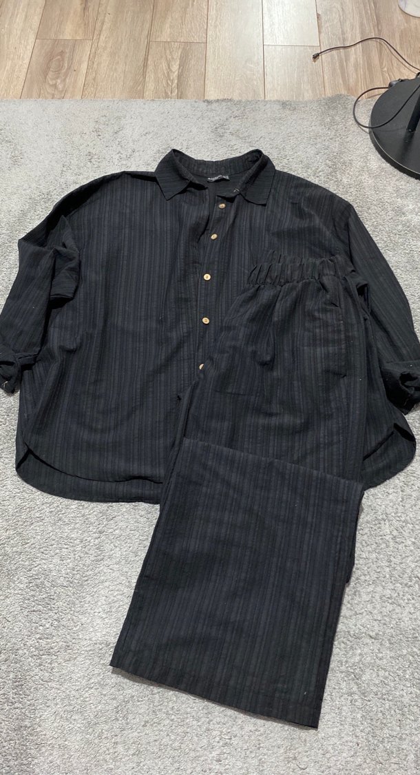 Uzun kollu, düğmeli siyah erkek pijama takımı. Notlu yakalı, bol kesim ve midi boy pantolonlu rahat tasarım.