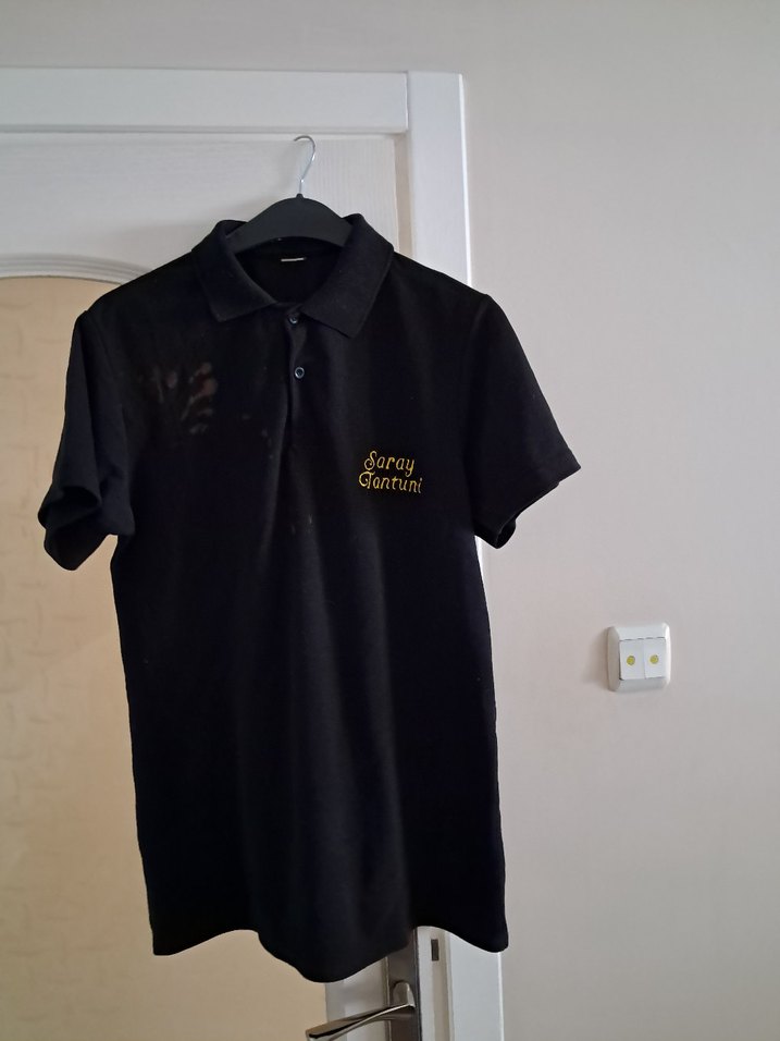 Kısa kollu, düğmeli, yakalı siyah erkek polo tişört. Keten kumaştan, bol kesim ve baskılı desenli. Günlük rahat sokak stili için uygundur.önünde leje var, köyde bağ bahçede giyilebilir