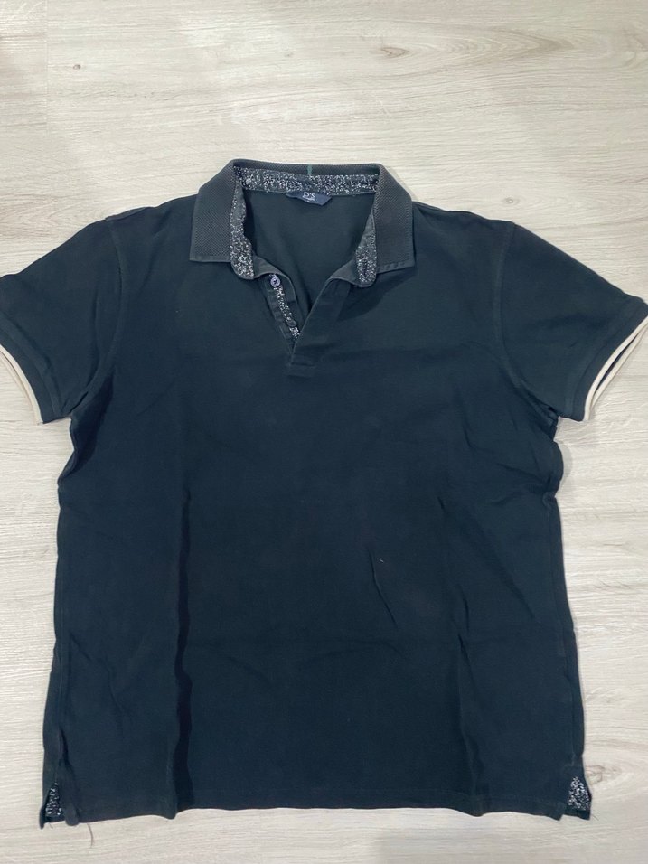 Siyah renkli, düğmeli yakalı ve kısa kollu erkek polo tişörtü. Düz desensiz, sentetik kumaştan, rahat kesim ve günlük kullanım için uygundur.