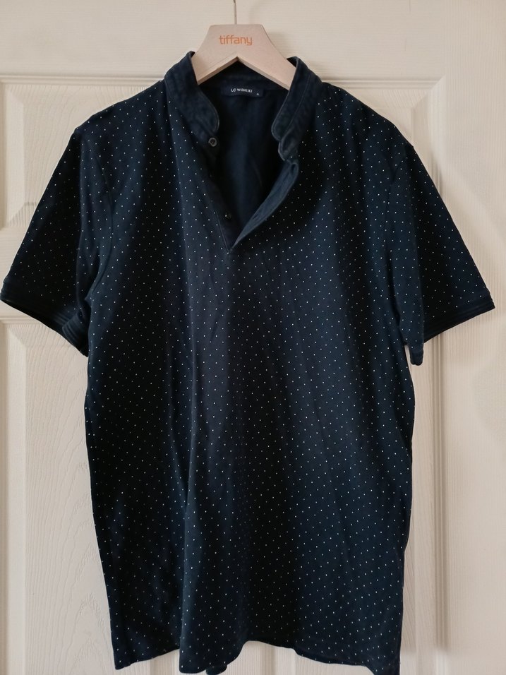 Düğmeli yakalı, kısa kollu siyah erkek polo tişört. Rahat kesim ve baskılı desene sahip, sentetik kumaştan üretilmiş gündelik sokak tarzı ürünü.