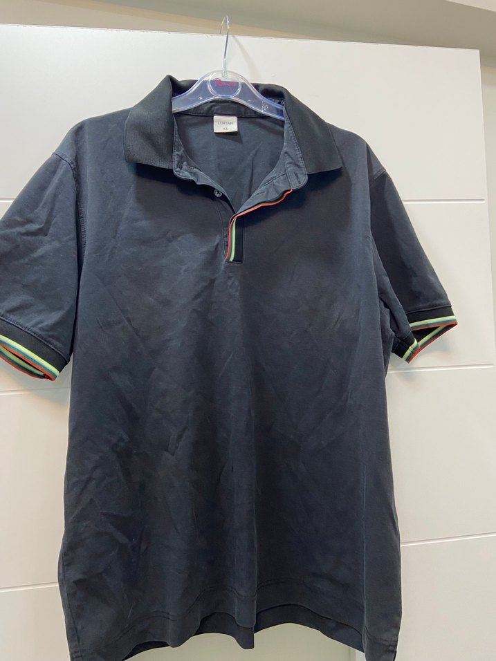 Düğmeli, yakalı ve kısa kollu erkek polo yaka tişört. Siyah renkte, sentetik kumaştan, bol kesim ve günlük kullanım için uygundur. Kollarda ve düğme detaylarında renkli şeritler bulunur.
