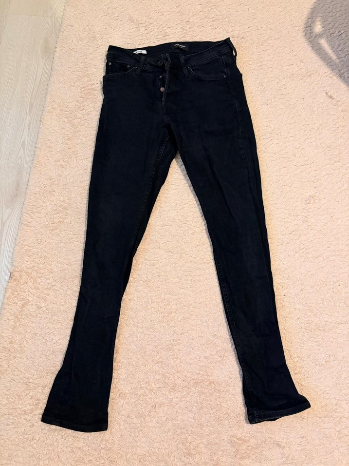 Düğmeli, siyah, dar kesim erkek jean. JACK & JONES markalı, günlük kullanıma uygun sokak stilinde kot pantolon.