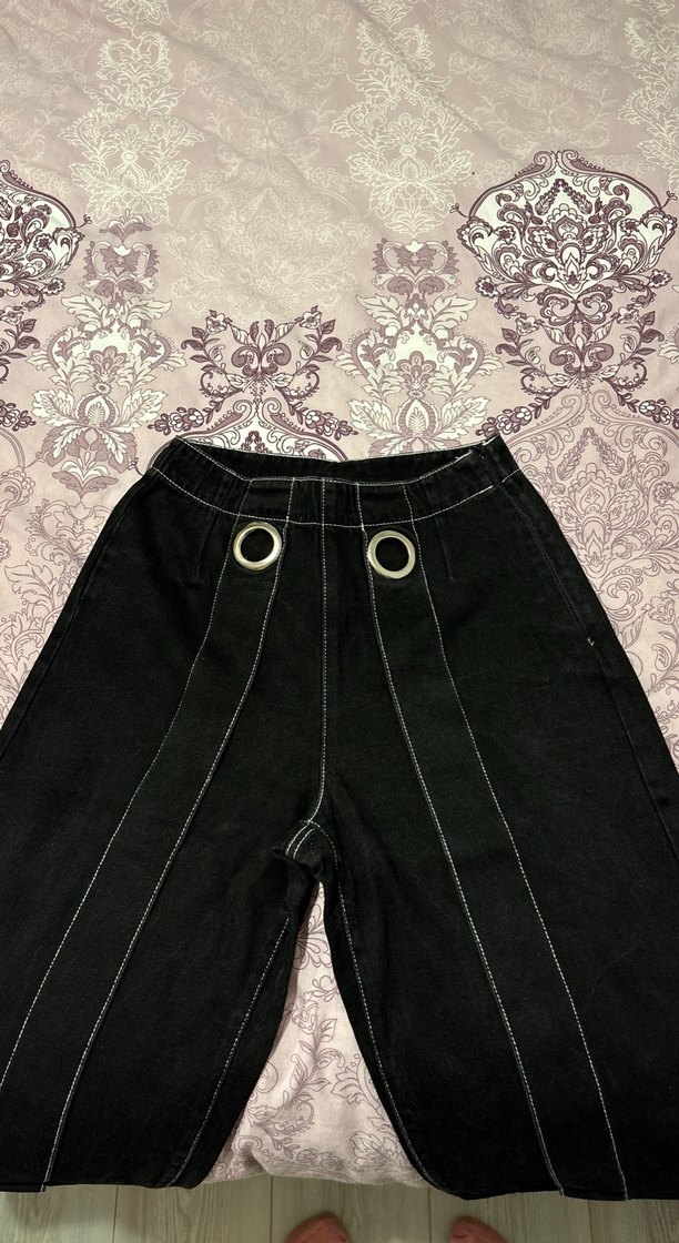 Kadın için siyah, düğmeli, geniş kesim kot pantolon. Beyaz dikiş detayları ve gotik tarzı yansıtır. S bedendir.