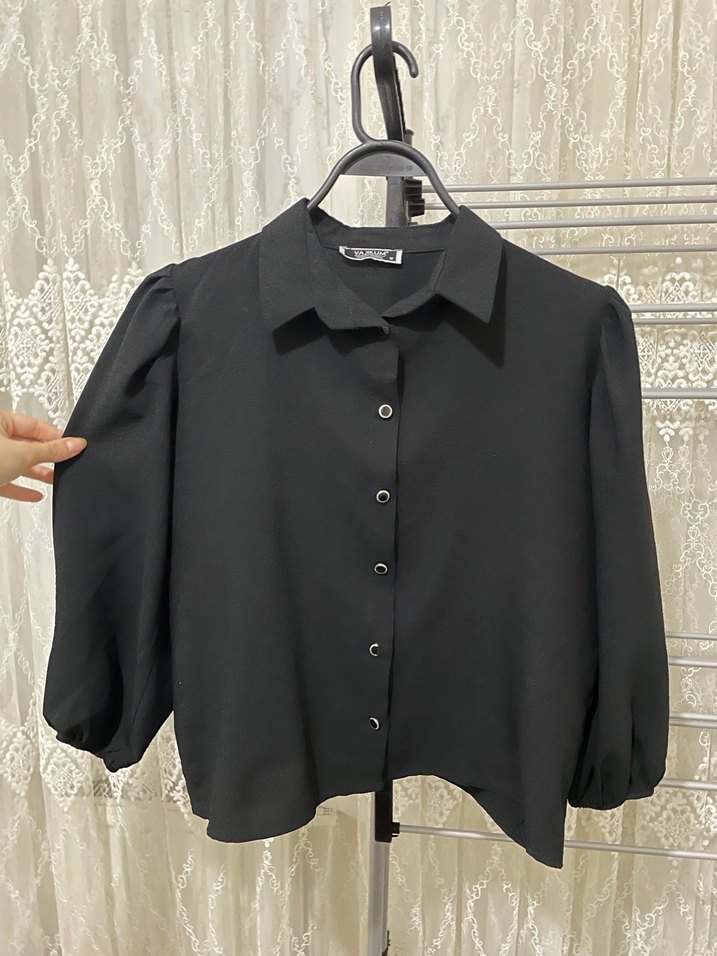Siyah düğmeli, yakalı ve uzun kollu keten gömlek. Orta boy ve regular kesim. Ofis ve günlük kullanıma uygun.