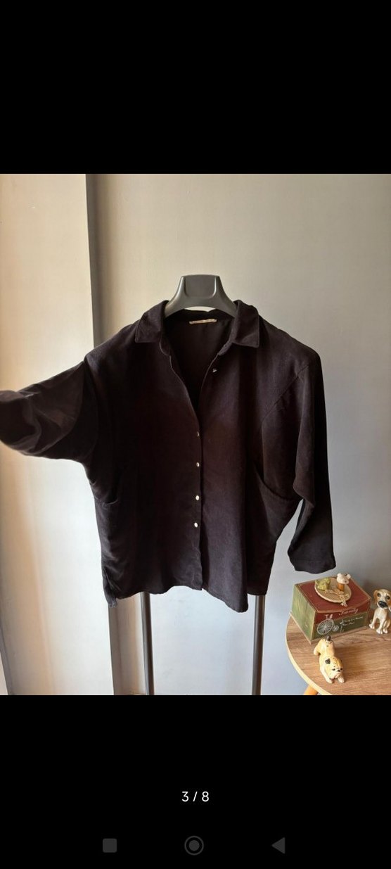 Uzun kollu, yumuşak kumaş siyah gömlek. Düğmeli ve geniş kesim, sade ve rahat günlük stil için uygundur. kol düğmeleri ve ilk boyun düğmesi yok. istenilen düğmeler dikilebilir.