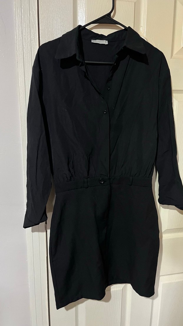 Siyah, düğmeli ve uzun kollu bu ince kesim gömlek elbise bir kere giyildi