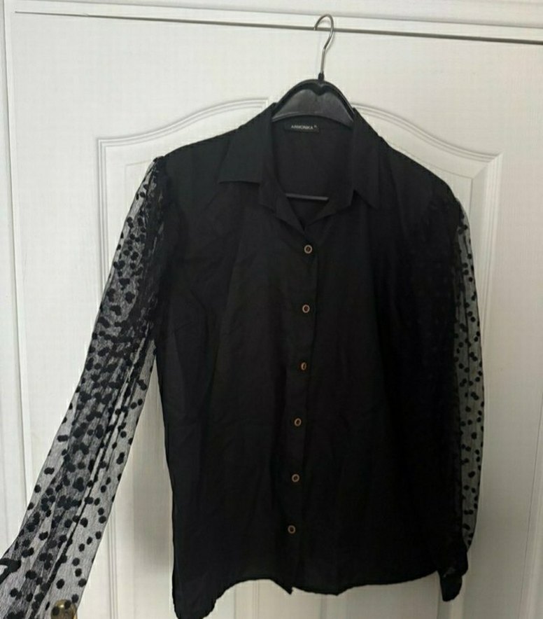 Siyah, uzun kollu, düğmeli ve yakalı kadın gömleği. Şeffaf desenli kollara sahip, rahat kesim ve ofis kullanımı için uygundur.