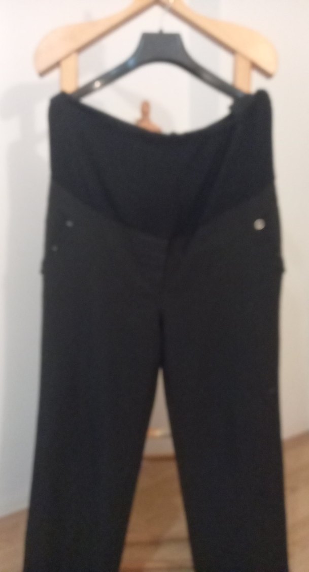 Siyah renkli, düğmeli ve normal boyda hamile pantolonu. Sentetik kumaştan, ofis kullanımı için uygun, normcore tarzda. Belinden ayarlamali defalarca giyildi.