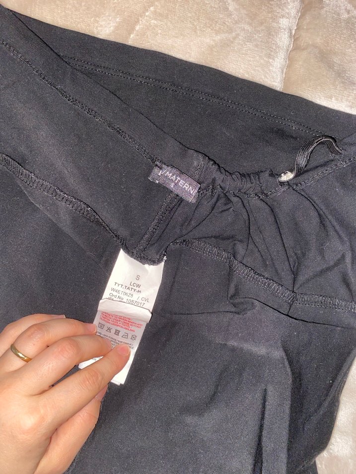 Pamuk kumaştan yapılmış, siyah, düğmeli ve normal boyda, vücuda oturan hamile pantolonu, günlük kullanıma uygun.