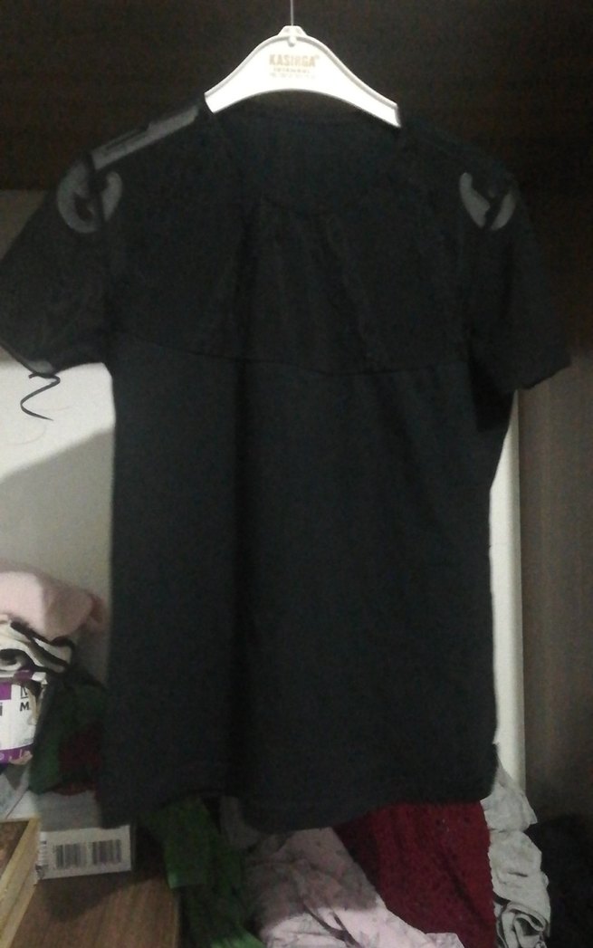 Siyah renkte, kısa kollu, düğmeli ve midi boyda hamile tişörtü. Sentetik kumaştan, bol kesim ve gotik tarzda tasarlanmıştır.