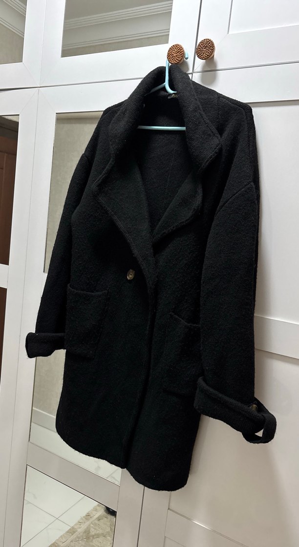 Siyah hırka, düğmeli kapanışa ve iki ön cebe sahip, yumuşak ve sıcak bir kumaştan üretilmiştir.