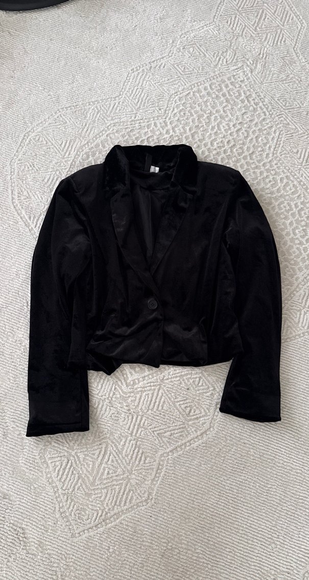 İpek dokulu, düğmeli, siyah kadın blazer. Uzun kollu, normal uzunlukta ve slim kesimdir. Ofis için uygun, gotik Paris tarzını yansıtır.