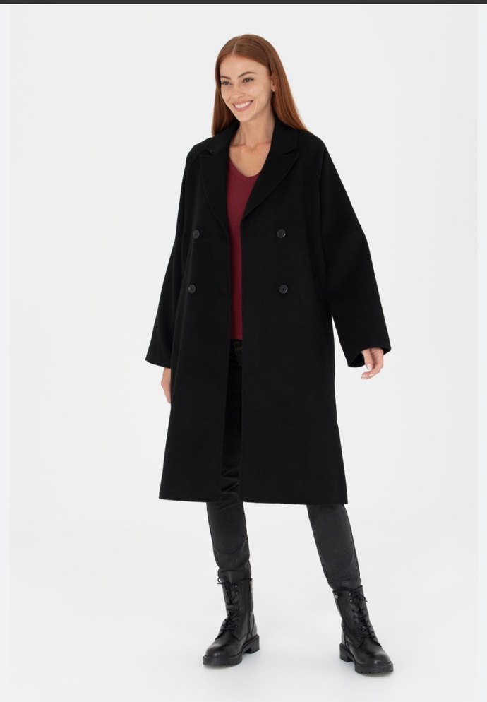 Siyah renkte, çift düğmeli, uzun kollu ve klasik yakalı şık bir kaban.