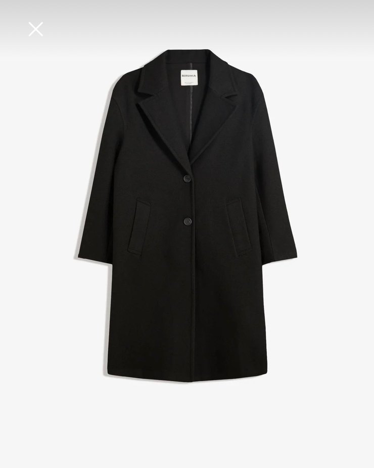 Siyah renkte, düğmeli kapama ve yan ceplere sahip klasik tasarımlı kaban.