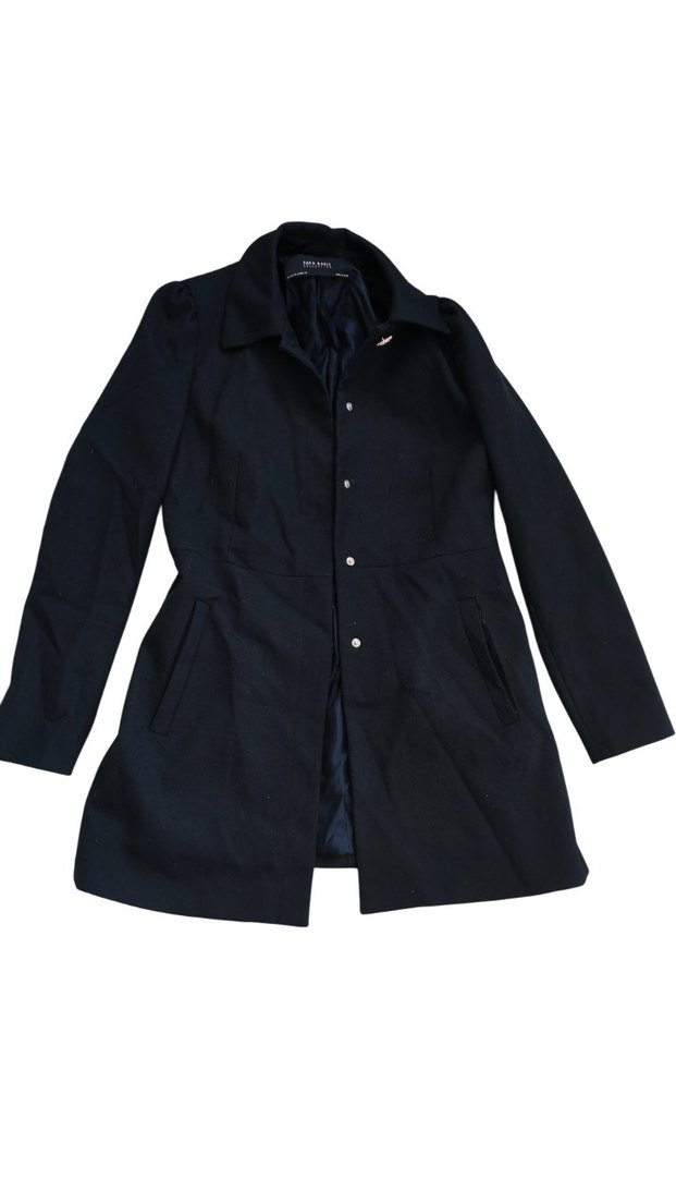 Düğmeli, yan cepli siyah kaban, iç kısmı yumuşak astarlı. Serin havalar için uygun.